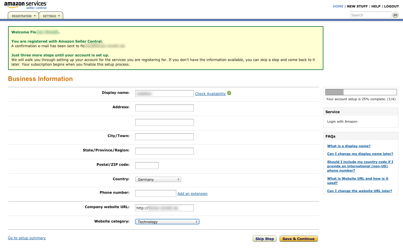 - If you get an error like this you need to register for an Amazon Seller Central account (see step 2). I know that this error message doesn’t really make sense. It took me some hours to find out that an Amazon Seller Central account is needed :-)