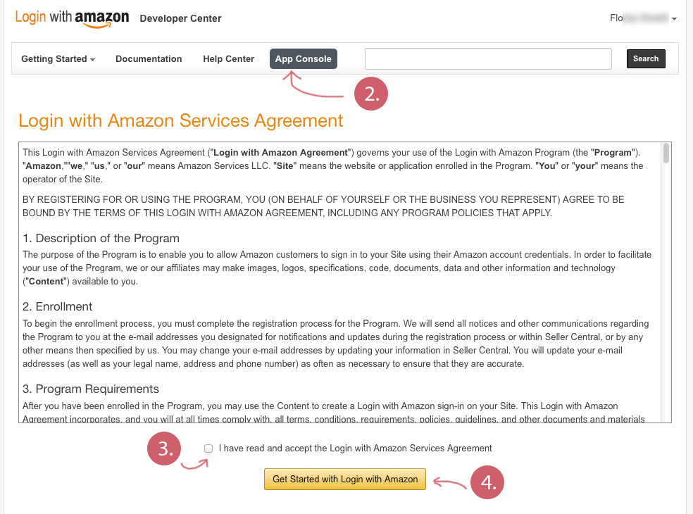 If you have already some Apps running on your Amazon account you may redirected to the App Console directly. You should agree to the service terms for the Login with Amazon service - After clicking the “Get Started with Login with Amazon”-button you should be redirected to the App Console.