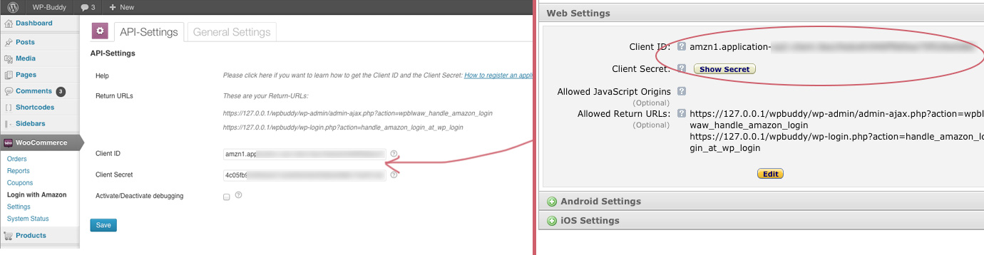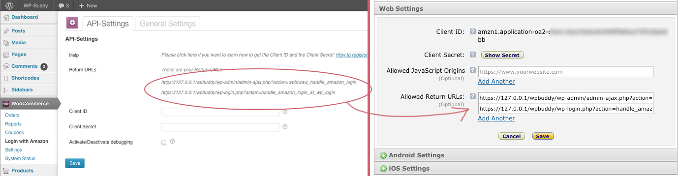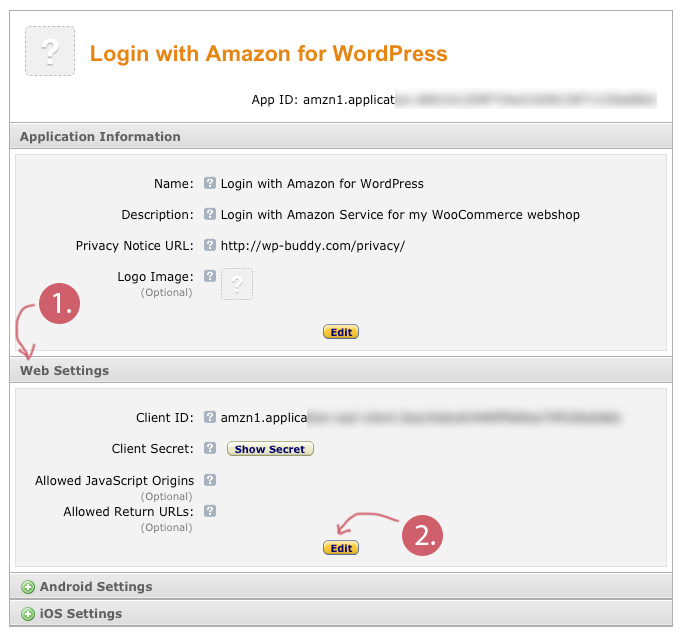 Click on the Web-Information tab and on the settings-button - Then open a new window and go to your WordPress administration panel. Go to “WooCommerce” and “Login with Amazon”. Copy and paste the URLs provided into the “Allowed return URLs”: