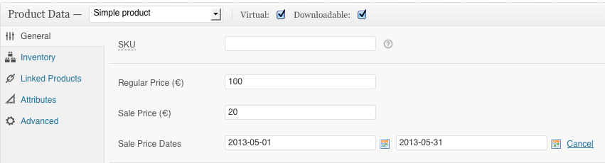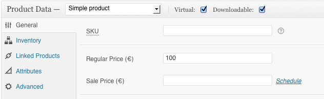 Choose “Products” from your WordPress administration panel - Scroll down to the “Product Data” screen and select “General”: