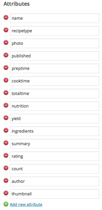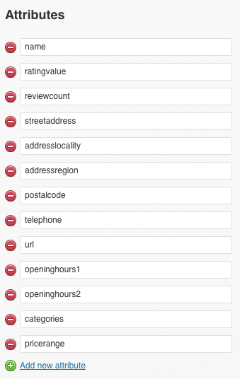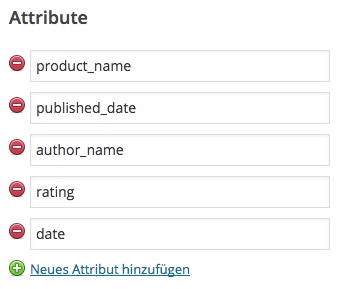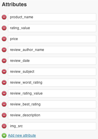 Product Review Rich Snippet Attributes<div itemscope itemtype="http://schema.org/Product"> <span itemprop="name">[product_name]</span> <br /><img src="[img_src]" alt='[name]' /><br /> <div itemprop="aggregateRating" itemscope itemtype="http://schema.org/AggregateRating"> Rated <span itemprop="ratingValue">[rating_value]</span>/5 based on <span itemprop="reviewCount">1</span> customer review </div> <div itemprop="offers" itemscope itemtype="http://schema.org/Offer"> <span itemprop="price">[price]</span> <span itemprop="priceCurrency">EUR</span> <link itemprop="availability" href="http://schema.org/InStock" />In stock </div> Product description: <span itemprop="description">[content]</span> My Review: <div itemprop="review" itemscope itemtype="http://schema.org/Review"> <span itemprop="name">[review_subject]</span> - by <span itemprop="author">[review_author_name]</span>, <meta itemprop="datePublished" content="<?php echo date( 'c', strtotime( $date ) ); ?>" />[date] <div itemprop="reviewRating" itemscope itemtype="http://schema.org/Rating"> <meta itemprop="worstRating" content="[review_worst_rating]" /> <span itemprop="ratingValue">[review_rating_value]</span>/ <span itemprop="bestRating">[review_best_rating]</span>stars </div> <span itemprop="description">[review_description]</span> </div> </div>