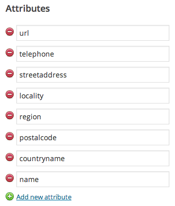 <div itemscope="" itemtype="http://schema.org/Organization"> <meta itemprop="name" content="[name]" /> <meta itemprop="name" content="[url]" /> <meta itemprop="telephone" content="[telephone]" /> <div itemprop="address" itemscope="" itemtype="http://schema.org/PostalAddress"> <meta itemprop="streetAddress" content="[streetaddress]" /> <meta itemprop="addressLocality" content="[locality]" /> <meta itemprop="addressRegion" content="[region]" /> <meta itemprop="postalCode" content="[postalcode]" /> <meta itemprop="addressCountry" content="[countryname]" /> </div> </div>